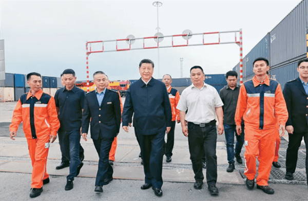 2024年4月22日至24日,中共中央總書記、國家主席、中央軍委主席習(xí)近平在重慶考察。這是22日下午,習(xí)近平在重慶國際物流樞紐園區(qū)重慶鐵路集裝箱中心站,同貨車司機、列車司機、裝卸工人、場站管理人員等親切交流。新華社記者 王曄 攝