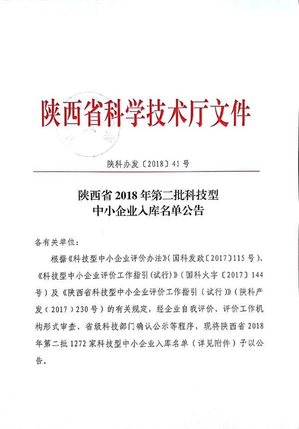根據(jù)《科技型中小企業(yè)評價(jià)辦法》(國科發(fā)政〔2017〕115號(hào))、《科技型中小企業(yè)評價(jià)工作指引(試行)》(國科火字〔2017〕144號(hào))及《陜西省科技型中小企業(yè)評價(jià)工作指引(試行)》(陜科產(chǎn)發(fā)﹝2017﹞230號(hào))的有關(guān)規(guī)定,我所在科技型中小企業(yè)評價(jià)系統(tǒng)上進(jìn)行自我評價(jià)、經(jīng)陜西省科學(xué)技術(shù)廳審查,被評定為陜西省科技型中小企業(yè),于2018年3月15日在陜西科技信息網(wǎng)上公示。