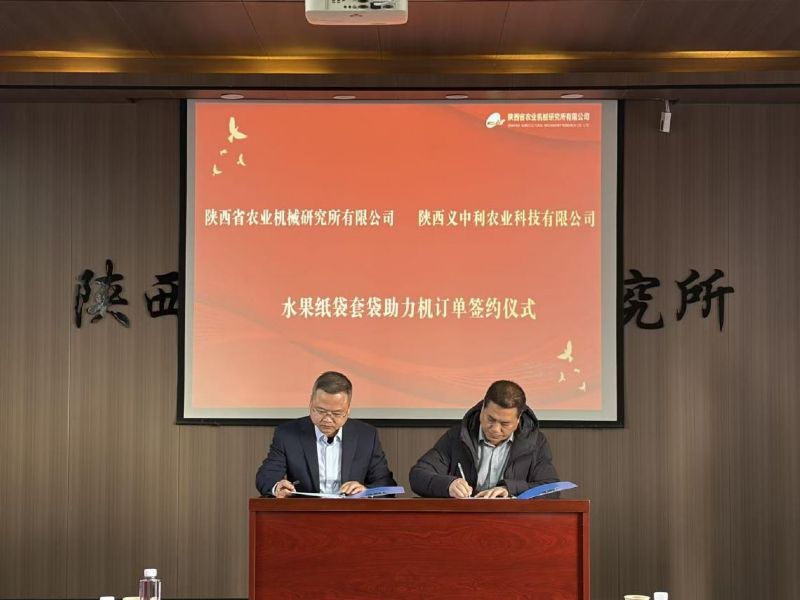 ▲公司副總經(jīng)理鄒超與陜西義中利農(nóng)業(yè)科技有限公司總經(jīng)理文強(qiáng)就水果紙袋套袋機(jī)采購(gòu)合同進(jìn)行簽約