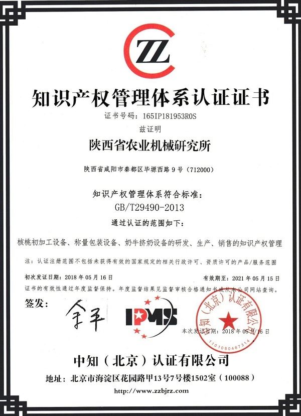 2018年5月16日,陜西省農(nóng)業(yè)機(jī)械研究所順利通過了中知(北京)認(rèn)證有限公司知識(shí)產(chǎn)權(quán)管理體系審核,并頒發(fā)了知識(shí)產(chǎn)權(quán)管理體系認(rèn)證證書。
