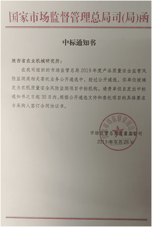 通過國(guó)家市場(chǎng)監(jiān)管總局質(zhì)量監(jiān)督司2019年度產(chǎn)品質(zhì)量安全監(jiān)管風(fēng)險(xiǎn)監(jiān)測(cè)類相關(guān)委托業(yè)務(wù)公開遴選,陜西省農(nóng)業(yè)機(jī)械研究所(陜西省農(nóng)業(yè)機(jī)械產(chǎn)品質(zhì)量監(jiān)督檢測(cè)總站)成功中標(biāo),成為全國(guó)農(nóng)機(jī)產(chǎn)品質(zhì)量安全風(fēng)險(xiǎn)監(jiān)測(cè)項(xiàng)目承檢機(jī)構(gòu)。這是我所繼成功中標(biāo)國(guó)家級(jí)產(chǎn)品質(zhì)量監(jiān)督抽查任務(wù)之后的又一重大喜訊!